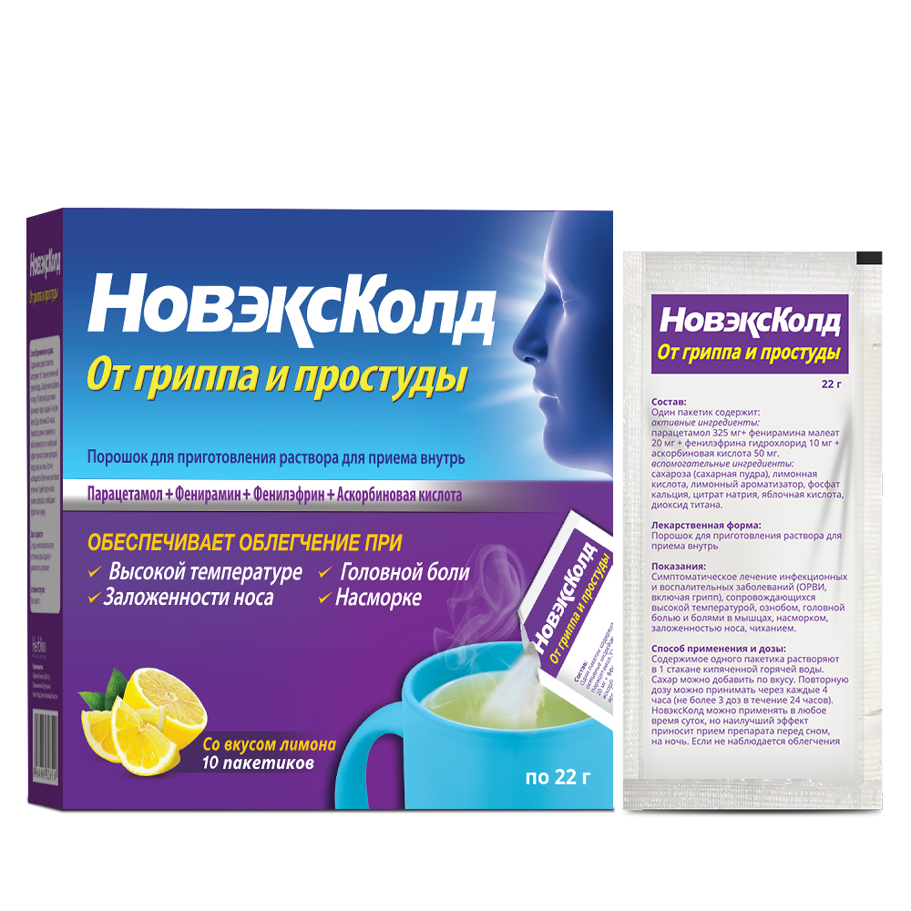 НовэксКолд, порошок для приема внутрь оказывает жаропонижающее, обезболивающее и противоотечное действие. Снимает симптомы слезотечения, насморка при простудных заболеваниях.